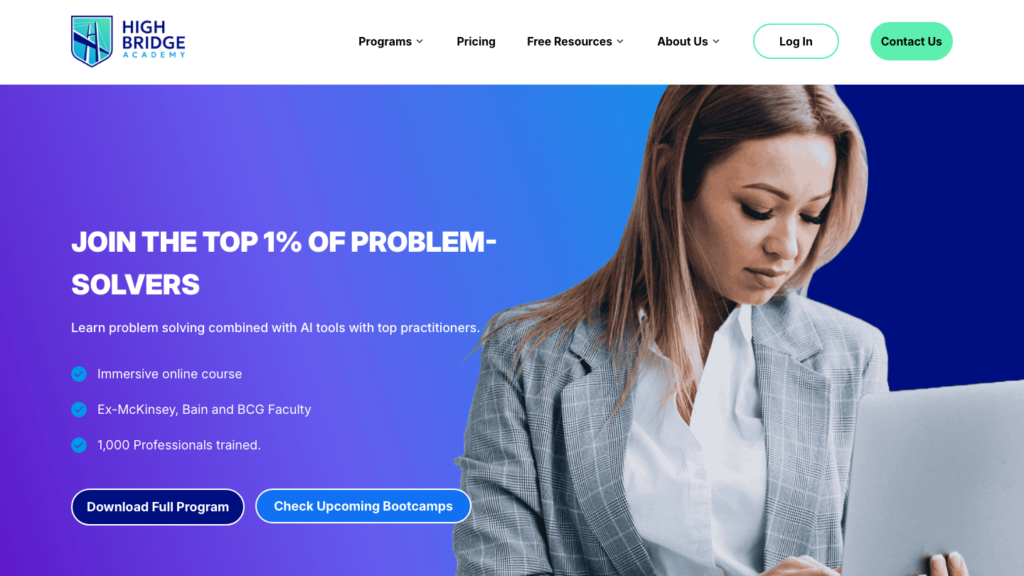 Strategy U is a strong self-paced option for structured problem solving. It covers issue trees, MECE thinking, hypothesis-driven analysis, and SCQA in one curriculum. High Bridge Academy’s BEB covers the same foundations but pairs them with stakeholder management and AI in a bootcamp format taught by former strategy consultants.