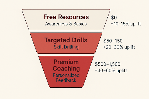 The real value comes from combining both: use free resources to build fundamentals, then invest in premium resources to refine and polish your performance.